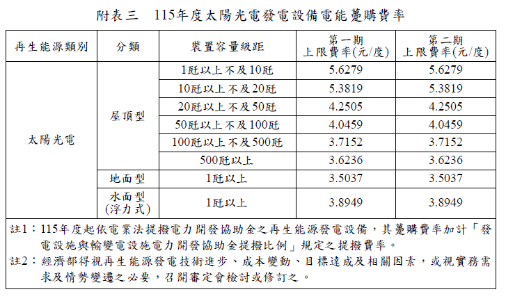 經濟部民國114年12月4日經能字第11458005150號 https://www.utopiaget.com/hot_527053.html 預告「中華民國一百十五年度再生能源電能躉購費率及其計算公式」草案 - 太陽光電 2025-12-07 2026-12-07